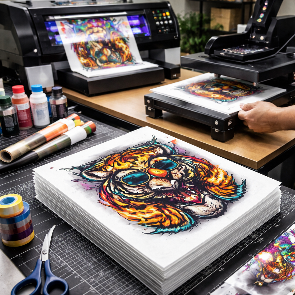 DTF (Direct-to-Film) printing allows vibrant designs to be transferred onto fabrics like t-shirts, hoodies, and apparel using heat.